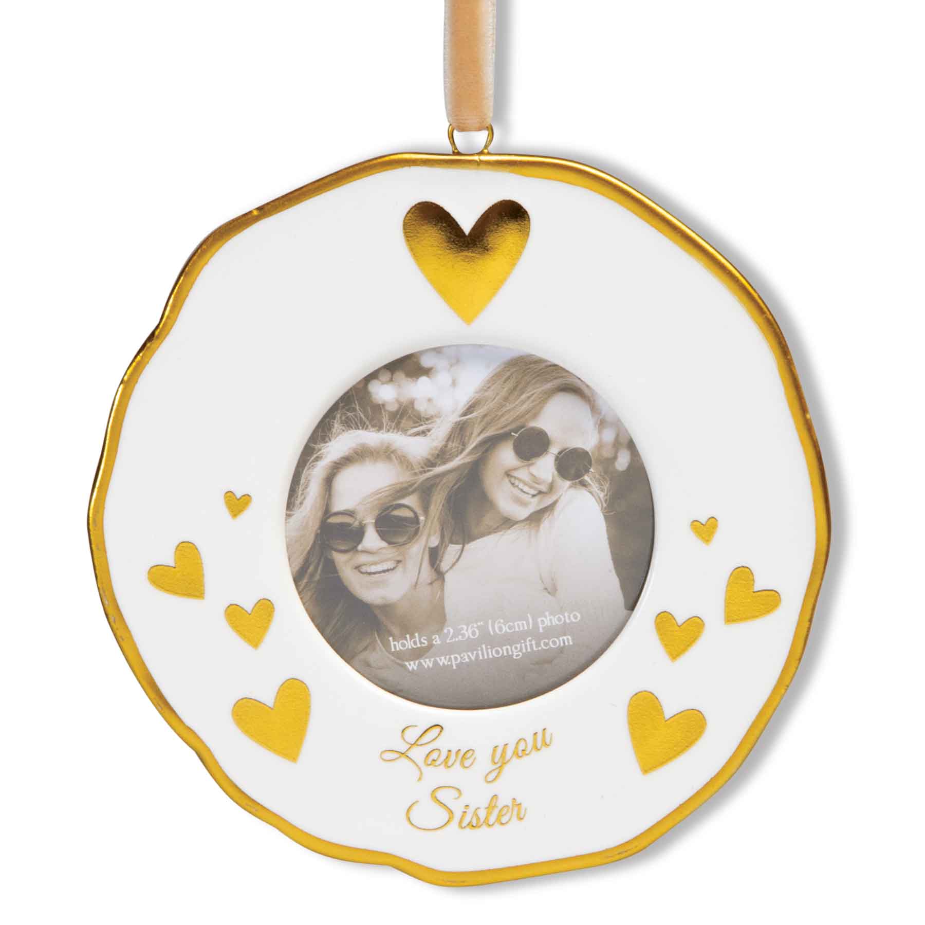 Celebrate the unique bond of sisterhood with this gold-accented ornament that holds a 2¼" photo. Champagne-colored velvet ribbon and metal hook for hanging.