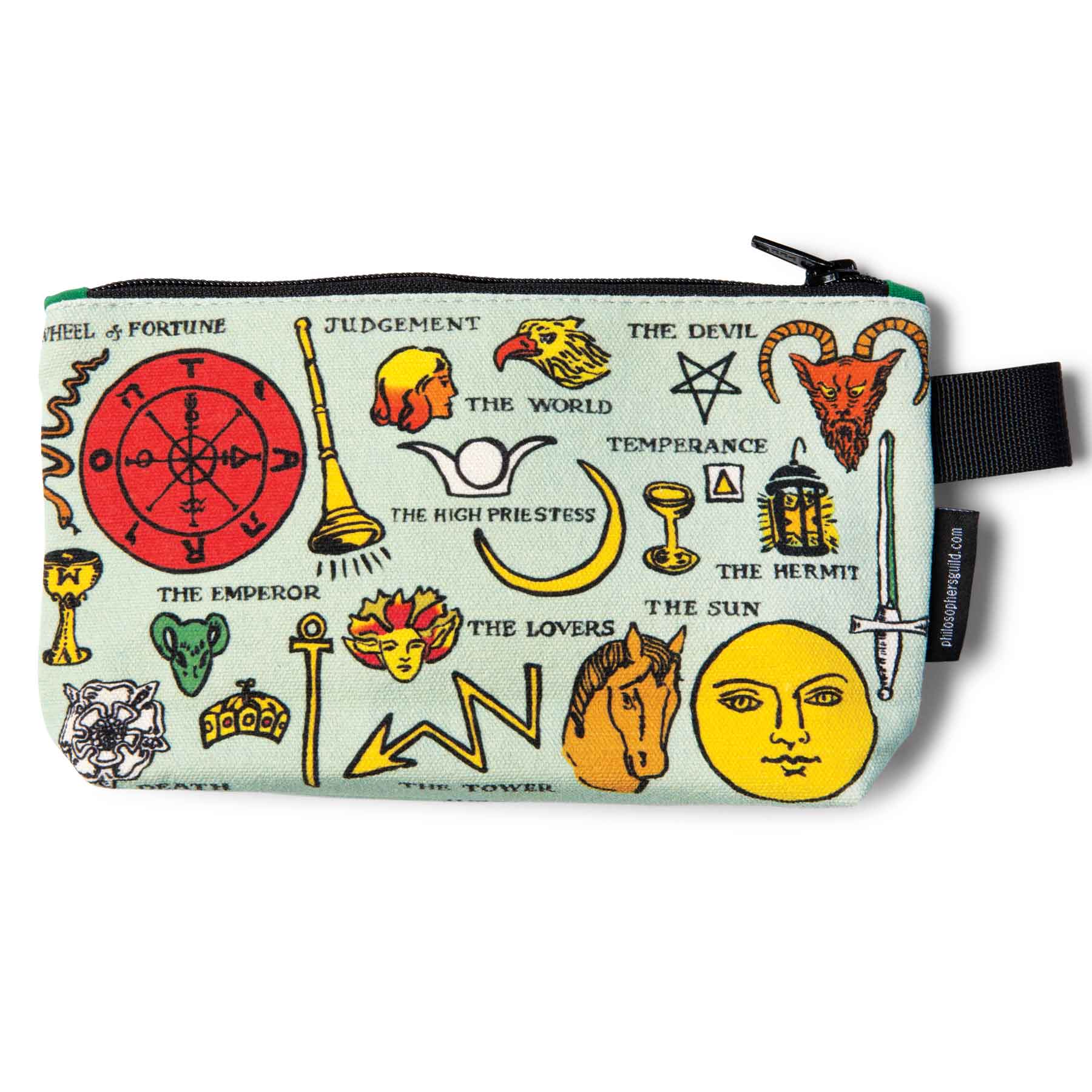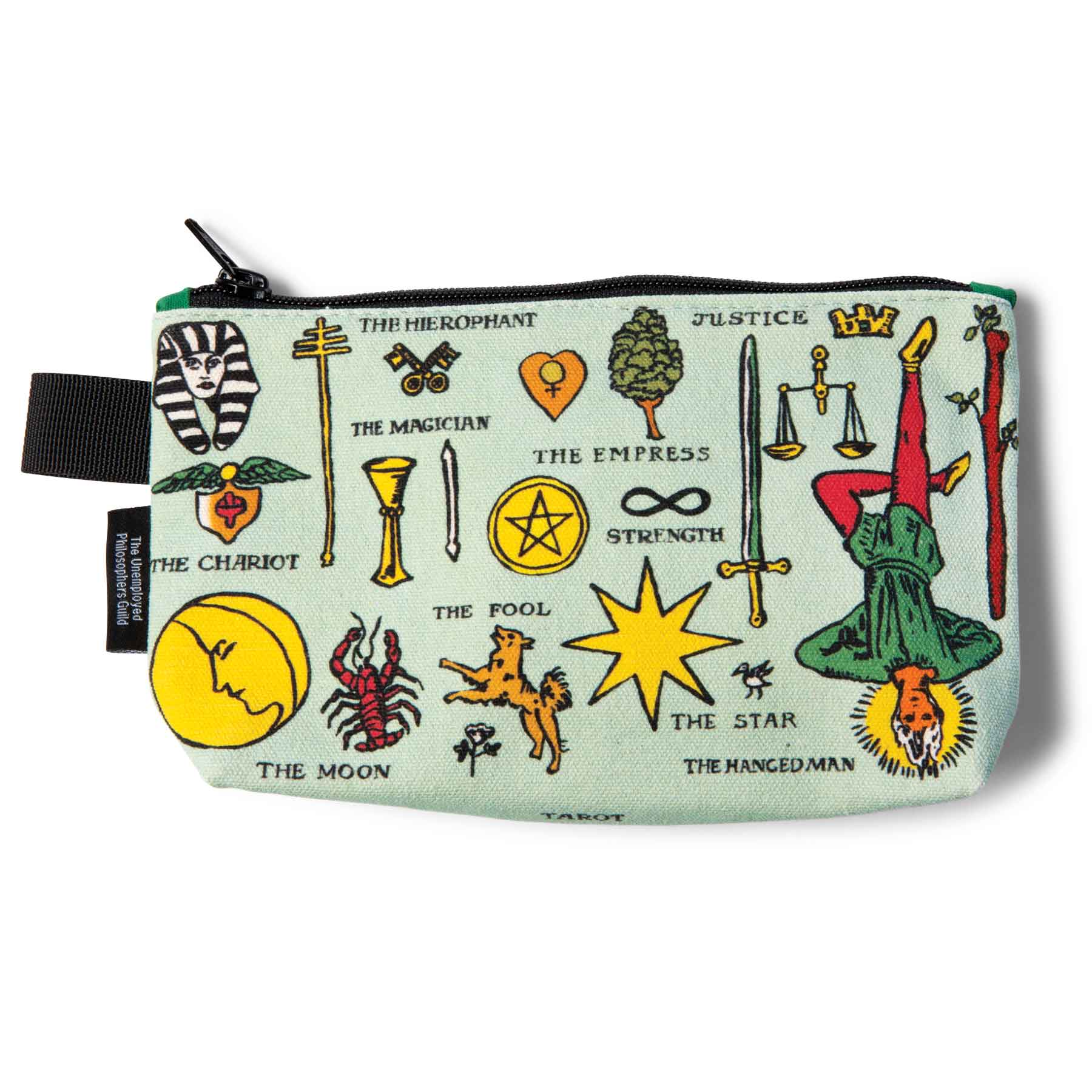 Introducing the Tarot Card Makeup Bag—the perfect accessory for visionary fashionistas! Featuring every classic symbol from a tarot deck, this bag brings a hint of mysticism to your makeup collection. Store your goodies in style with a fully lined cotton fabric that holds up in any conditions. The dimensions of 5" L x 9" W provide reliable storage that's big enough to hold whatever you need on the go without being bulky or taking up too much space. Put your destiny in the cards with the Tarot Card Makeup Bag!