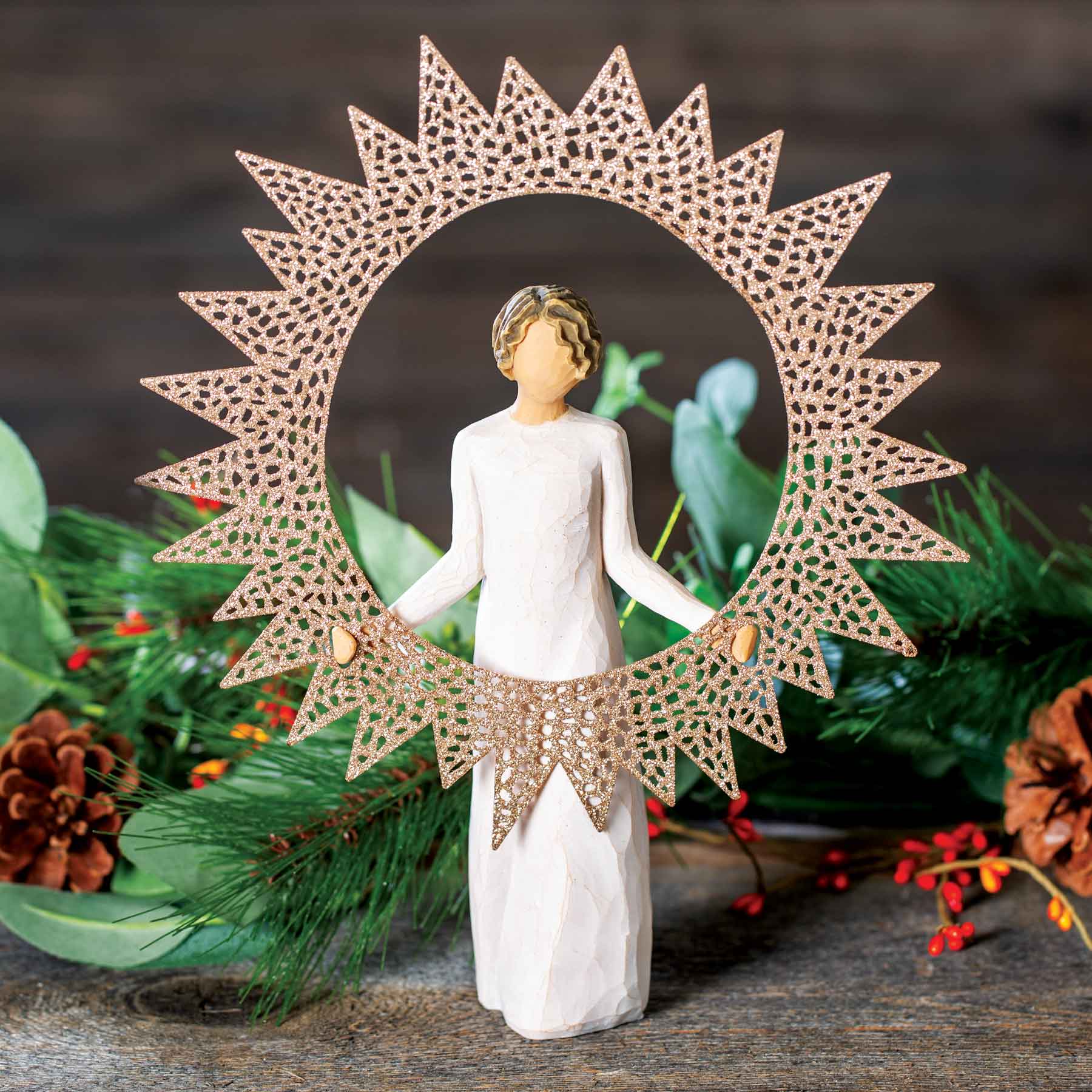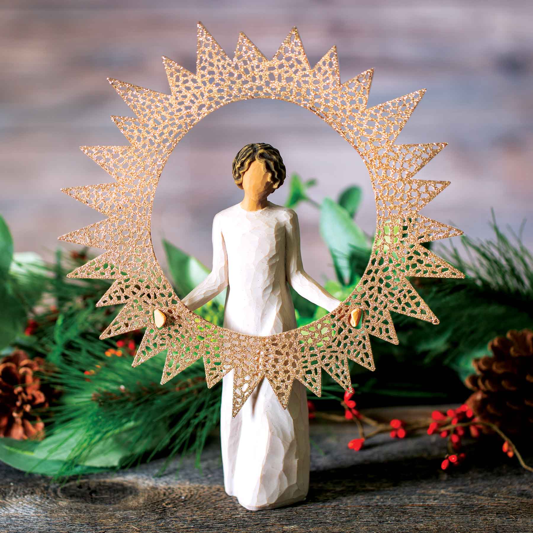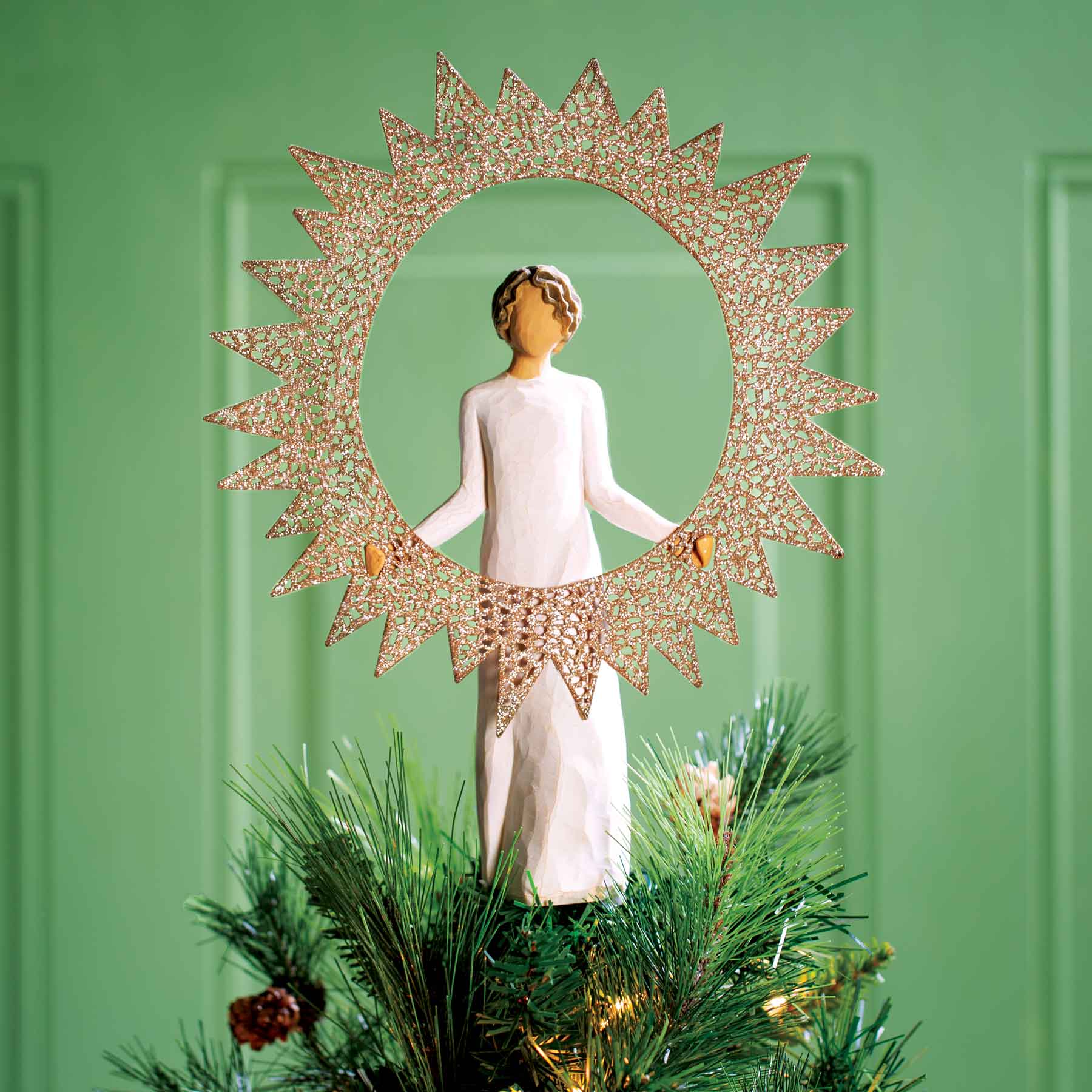 Elevate your festive décor with the Willow Tree Starlight Tree Topper. Exquisitely designed, this tree topper features a delicate pierced metal star, generously encrusted with glitter, ensuring it captures and radiates light from every angle. Its inside is thoughtfully hollowed out to easily fit atop your tree, securely embracing the top branch. Standing at a statuesque 12"h and crafted from a blend of resin and metal, it is both durable and visually captivating. A piece from the Willow Tree® collection always holds a special sentiment, and this tree topper is no exception, epitomizing warmth, light, and love. Carefully maintaining its beauty is easy; simply dust with a soft cloth or brush, avoiding water and solvents. Let this sparkling tree topper be the crowning glory of your holiday celebrations.